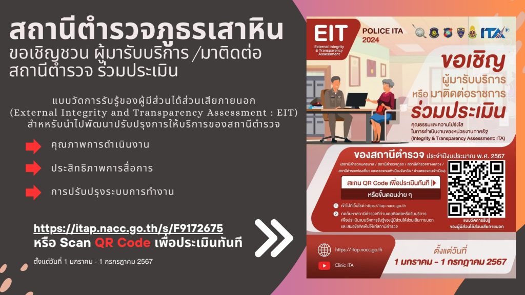 ขอเชิญผู้มารับบริการหรือมาติดต่อราชการร่วมประเมินคุณธรรมและความโปร่งใสในการดำเนินงานของหน่วยงานภาครัฐ ITA ของสถานีตำรวจนครบาล หรือสถานีตำรวจภูธร ประจำปีงบประมาณ พ.ศ. 2568