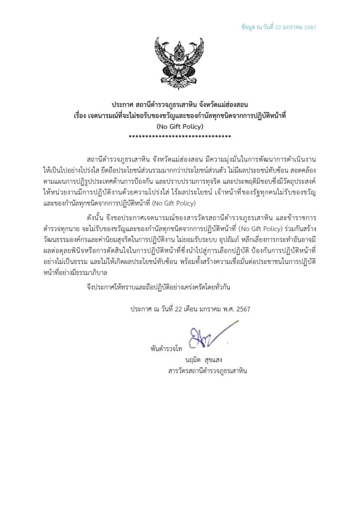 สภ.เสาหิน ประกาศ No Gift Policy 2567 ภาษาไทย